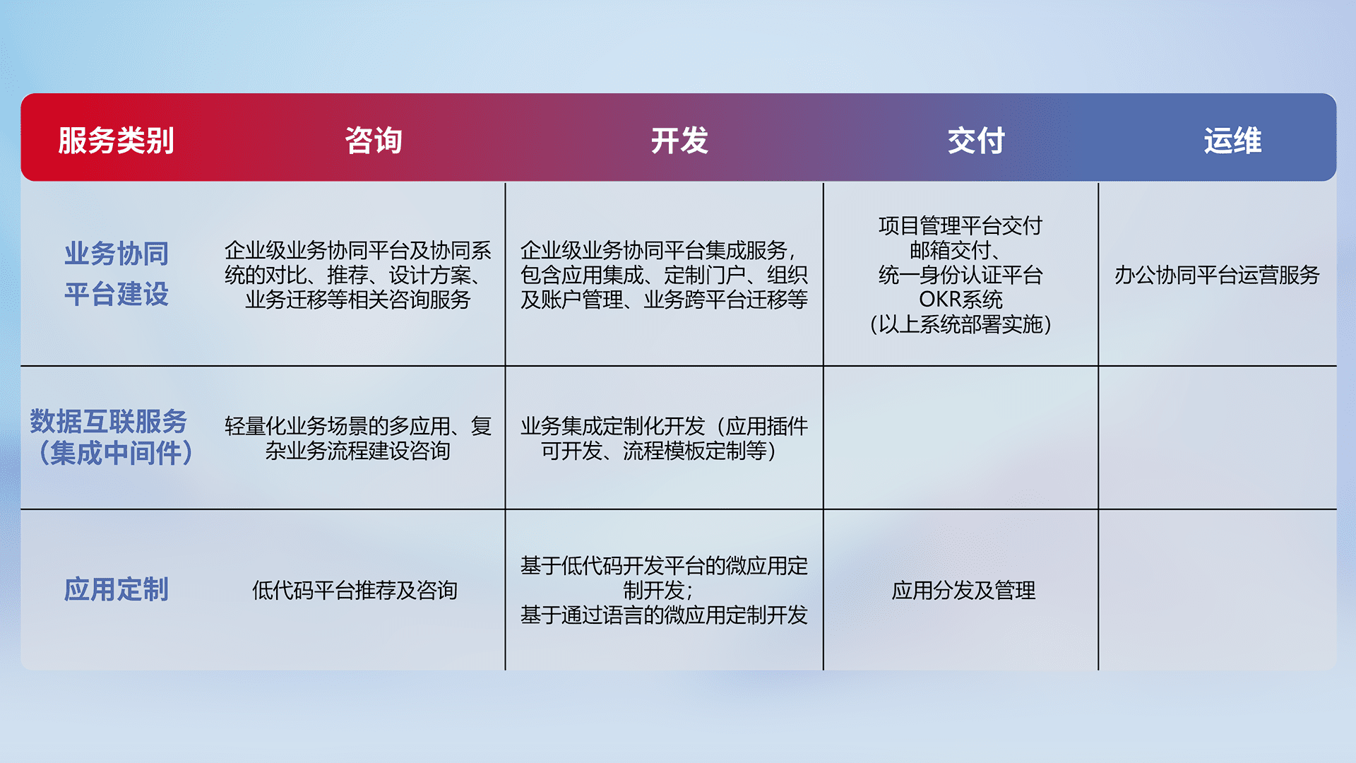 针对钉钉、、、、企微、、IDaas等平台级产品提供产品的规划、、、、方案、、、、交付、、、、定制化开发等服务,,,,实现如统一协同办公、、、智能客户服务、、、、混合会议管理、、、、智能数据查询、、、等业务场景,,,实现数字化转型。。