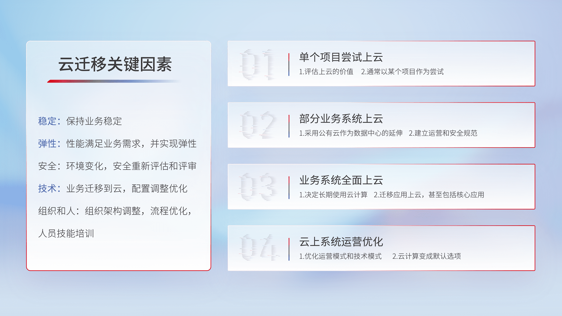 结合实际业务,,从规划设计、、、、云平台选型、、、、云原生改造、、、、数据迁移、、集成交付,,,,迁移全过程为客户识别最佳上云路径,,,做好风险识别管理,,,设计网络架构、、、身份权限、、、安全审计合规、、、、操作审计、、、日志审计、、、、监控告警策略、、、多站点容灾设计等,,对云上基础设施进行整体规划,,提升IT治理水平,,以满足弹性、、、高可用、、高性能的需求。。。。